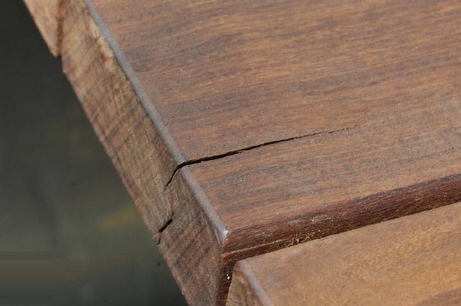 Het scheuren aan de kopse kant ontstaat vanwege het ontbreken van eindafdichting na het afzagen van de planken. Veel terrasbouwers installeren meteen de verzaagde planken. Dit is niet correct voor Braziliaans hardhout. Het is belangrijk te weten dat de houtvezels van Braziliaans hardhout erg compact zijn.